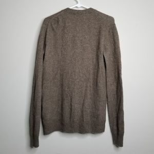 Medium button up sweater cardigan in brown and grey heathering. 4 front buttons. Ribbed hem and sleeve cuffs.