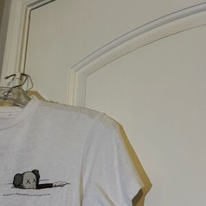 This is a rare and collectible Uniqlo x KAWS collaboration short sleeve T-shirt, featuring the iconic Companion character floating in a deep blue sea on the back, and resting face-down on the front chest pocket area. Tagged size 9-10 (youth sizing), this soft white cotton tee is perfect for little hypebeasts and mini collectors of streetwear art. This tee has a few faint stains on the front, which were hard to capture in photos but are disclosed — feel free to send an offer. The overall condition is good with no holes or rips. A true gem for fans of the designer collab world and KAWS art style.