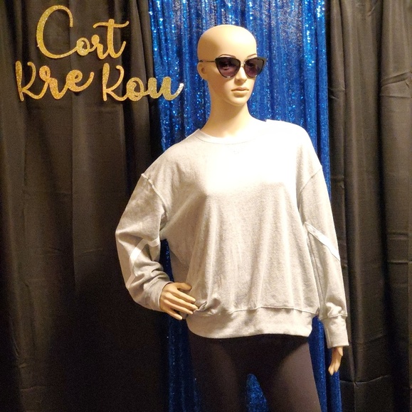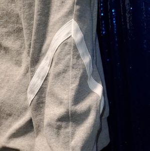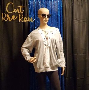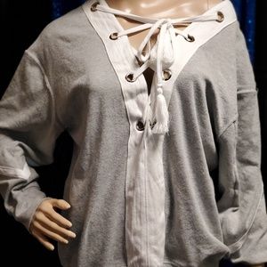 Lightweight sweater with tie up back. Ends of tie is fringed.