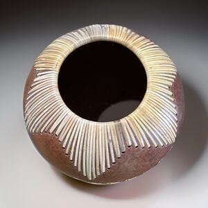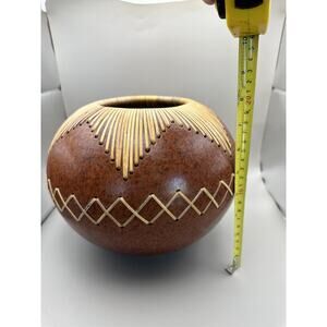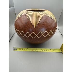 Unusual Ceramic Bowl that measures 8 inches tall and 10 inches wide. It has a dark red/brown glaze and is unmarked. It has had holes cut into the piece and then straw/raffia typed material has been threaded through the holes creating an abstract design. It is in excellent condition.