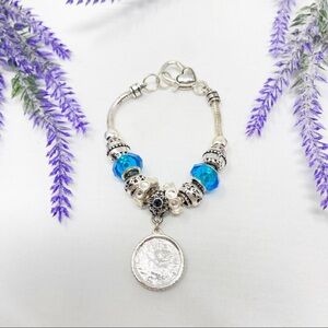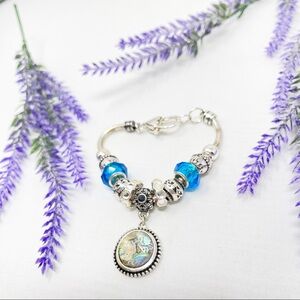 Pretty silver toned cable metal charm bracelet with multi colored beads with different stones and intricate engraving. One large dangling charm with abalone MOP inlay