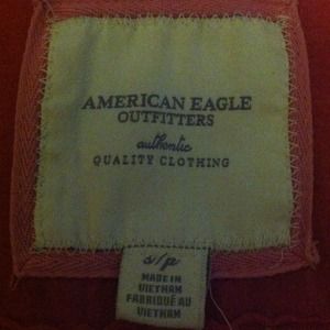 This is really cute - it's a pink hooded v-neck from American Eagle Outfitters. It has writing on the inside, which shows through a bit on the other side (it's designed to look like that!). Size small. Thanks for looking!