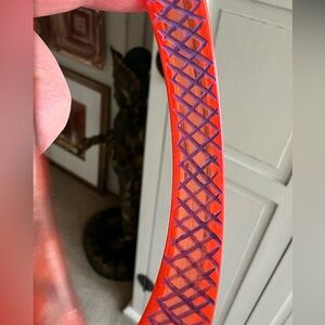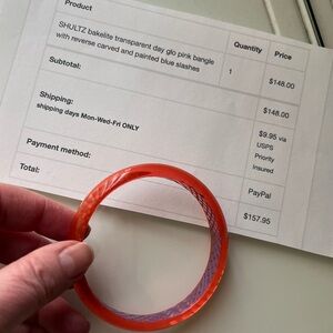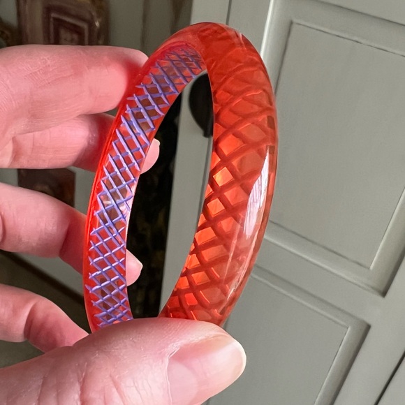 I haven’t seen another Bakelite bracelet like this one before. It’s sort of a transparent orange, and the inside is hand carved and painted in blue. It’s really a stunner!!