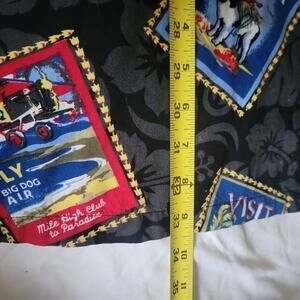 This unique Big Dogs shirt features the rare “Postage Stamps” design, showcasing colorful, Hawaiian-themed postage stamps over a black background with a subtle muted floral pattern. A true Y2K style piece with a fun BOHO vibe.