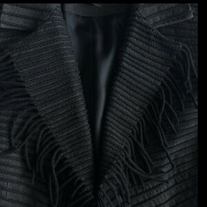 Details: Ribbed diagonal texture, dramatic fringe lapels + hem, fully lined