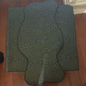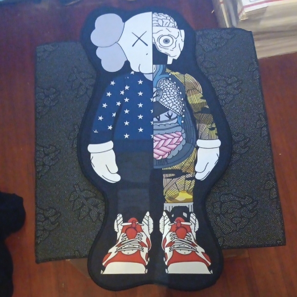 Eye-catching black rug with a multicolor character design. Features intricate patterns and bold colors.