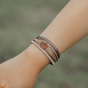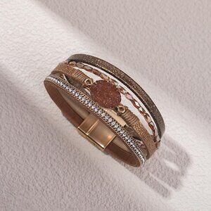 Features: This eye-catching multi-layer bracelet wraps around your wrist beautifully. It features strands of resin stones and a single strand of shimmering crystal beads, giving that boho-chic vibe. The magnetic buckle makes it super easy to wear. The bracelet measures 7.7 inches long and about 0.9 inches wide — just the right size for a stylish pop of detail.