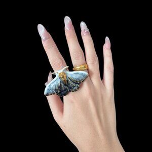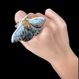 Stunning moth-shaped handmade ceramic ring featuring intricate gold accents. Perfect for adding a unique touch to any outfit.