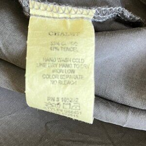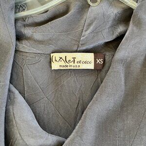 Unique and fun Chalet et ceci cowl neck dress. Sleeveless with draped cowl neckline. Crinkle fabric in gun metal grey. Extra full swing dress with unique hemline that accentuates the skirt and movement of dress. Note picture of bottom of dress. Easy care. Effortless comfortable style. Size says XS, but wears more like a generous small or medium in chest and full cut body is generous. In excellent condition.
