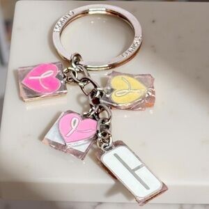 Unique Clinique keychain in silver tone metal NWT. Can be used as a charm. This Clinique keychain is a substantial piece, this is a fairy well made keychain. I was impressed by the craftsmanship when I received this as a gift.❤️ The colors are pink,baby pink & iconic butter yellow . This is perfect for the the Beauty lover, breast cancer survivor, or just someone who loves to support a great cause!! ❤️The cost is per key chain but if you want both, I will give you a 15% off discount. 💕