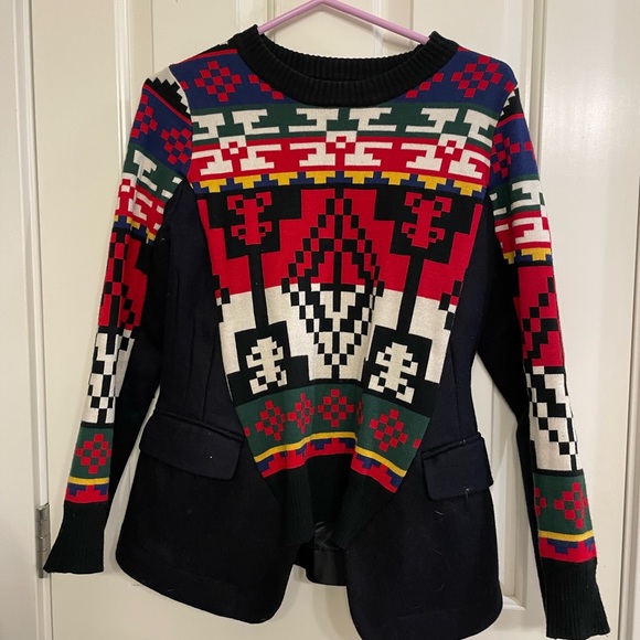 Embrace vibrant style with this colorful geometric sweater. Perfect for adding a pop of color to your wardrobe.