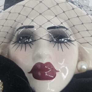 This handcrafted piece features a striking depiction of a lady's face, adorned with a black velvet collar, delicate black lace trim, and a dramatic feathered hat with a silver accent. A sheer black veil drapes elegantly over the face, adding an air of mystery.