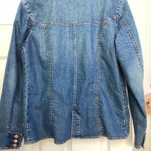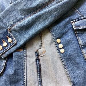 I love this denim jacket. Only giving it up because the sleeves are too long for me and all the cool extra buttons make it so I can’t make them shorter. Sleeves are 24” from top of shoulder to cuff. P to P measurement is 20.” The cotton/polyester mix makes it very comfortable. Length is a good 26.” LONDONJEAN