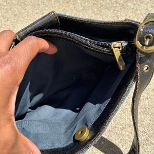 Black and navy denim bag with faux leather braided straps. General grungy wear on the leather parts (I think it is part of the design). Small sized shoulder bag