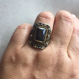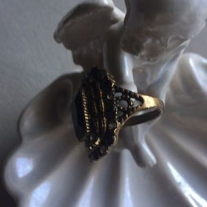 Long black center stone decorated with small zirconium white alternating with small black stones. Gold color size 8 ring.