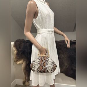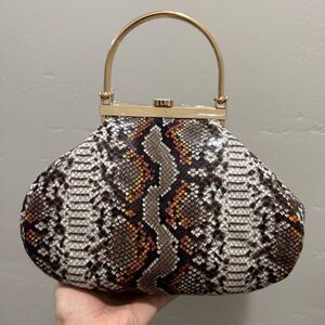 Brand new. Only one available. Handmade from genuine cowhide leather snake skin textured embossed, exquisite metal frame with top handle. Spacious enough for your phone, cosmetics, wallet, sunglasses, compact umbrella, & other items. It's perfect for casual wear, any event, evening out, or a gift for an important someone.