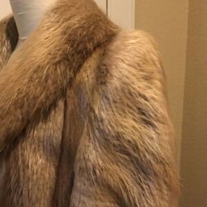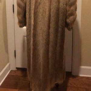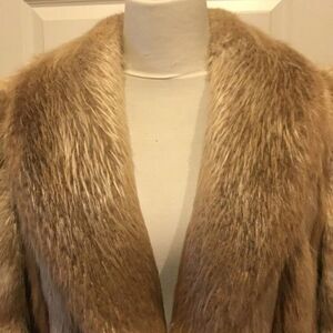 This a gorgeous natural wild beaver fur coat. The fur is thick and soft; it has been well kept and shows minimal signs of wear. The coat is complimented by a toffee brown lining that is clean and in good shape. There are some moth holes along the very bottom of the coat. Also there is some matting along the bottom of the coat. Please refer to pictures but neither issue take away from this gorgeous coat.