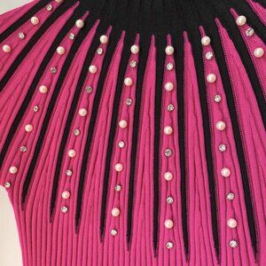 Fuchsia pink & black knit top with pearls & rhinestone embellishments! This is a super fun & unique #y2k going out top. There is a stain down the front but I’m sure it’s removable & not very noticeable generally.