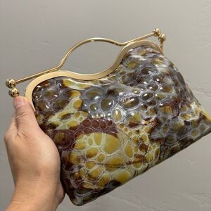 Unique Embossed Cowhide Handmade Double Kisslock Handbag, Includes Small Clutch