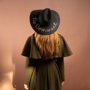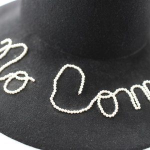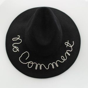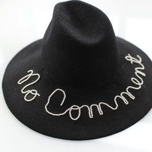 Step into the spotlight with our one-of-a-kind black hat by Eugenia Kim, blending whimsical charm with everyday functionality. Adorned with the cheeky "No comments" print and embellished with elegant pearls along the brim, this hat is a statement piece that demands attention. Available in size M, boasting a 22-inch head circumference and a 16-inch diameter, it's crafted for a comfortable yet stylish fit. Arrives in gently used condition.