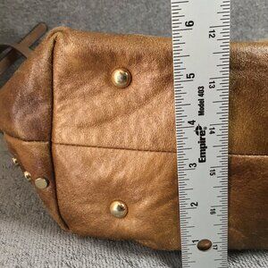 I love this bag it is so unique. It is reversible so there are no interior pockets. Gold stud accents. Roomy.