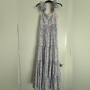 • Details: Light blue base with soft pink leaf print, ruffled straps, tiered maxi length.