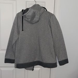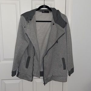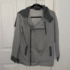 Not sure about size. I would guess a Medium! Zippers, buttons. Versatile jacket that feels like a hoodie!