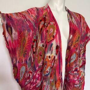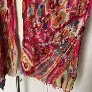 Gently used condition, hole as seen along front seam, possibly old button hole. Small hole in back, pictured very hard to tell because of all of the detail and embroidery. Beautiful one of a kind vintage piece, add artistic flair and color to any wardrobe.