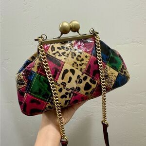 Only one available. Uniquely beautiful purse, vintage style kiss lock design. Handmade from genuine patent cowhide leather with patchwork pattern printed. Spacious enough for your phone, wallet,sunglasses, compact umbrella, cosmetics, keys & other items. Use in multiple ways, wear as a clutch, shoulder bag or crossbody.