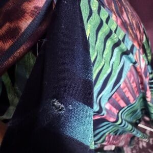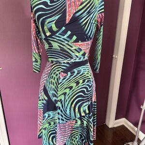 Beautiful dress made from stretchy rayon/poly. Size small with about a 28” waist unstretched and 39” hip. Has a tony hole in the self tie belt that can easily be flipped and covered.