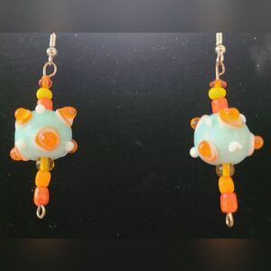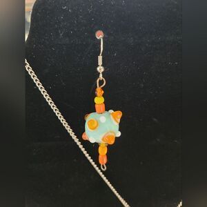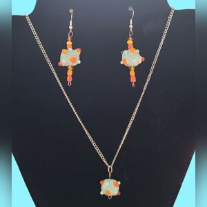 Unique Glass Beadwork Earrings and Necklace. Blue, Orange, and White J1-23