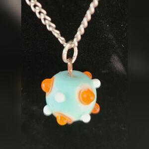 The earrings are made of glass beads in bright colors with unique patterns. Matching earrings and necklace set. Glass Bead Pendant is on a 25" silver toned chain with lobster closure.