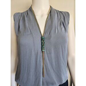 Multi-stranded gold-tone necklace with eight cylinders/rings with teal-colored crystals. Lobster clasp with extender.