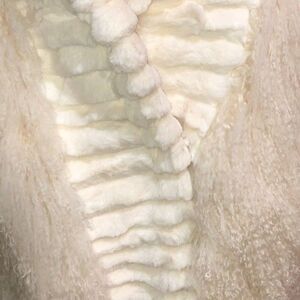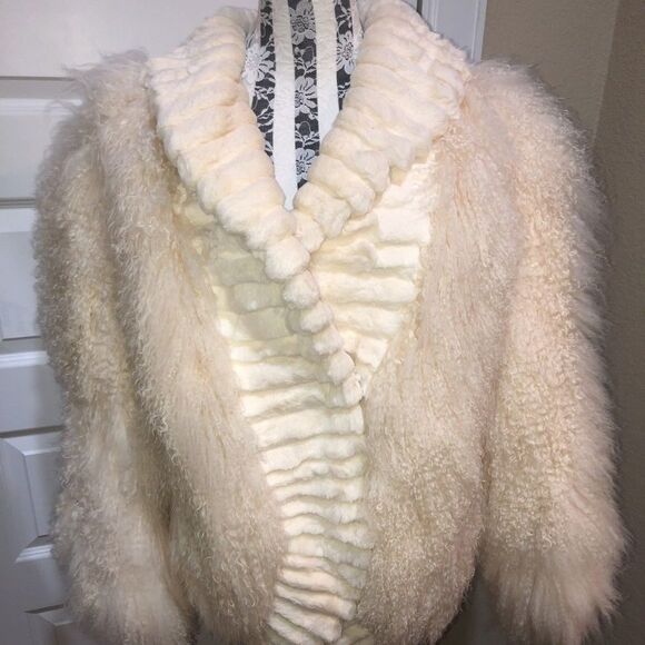 Gorgeous Cream Mongolian Lamb and Rabbit Fur Coat. This cream Mongolian lamb and rabbit fur coat has a collar, hook-and-eye fasteners, and pockets. The majority of the coat is Mongolian lamb, but the rabbit is on the collar and down the middle in a unique design. The interior has a silky texture with a monogrammed name with the Highland Park Furs tag in it.
