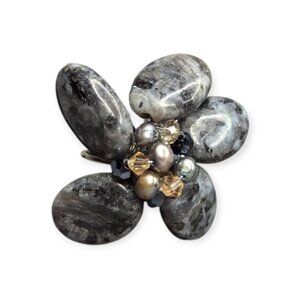 Unique Gray & Black Stone Ring with Open Band to Fit Most Sized Fingers