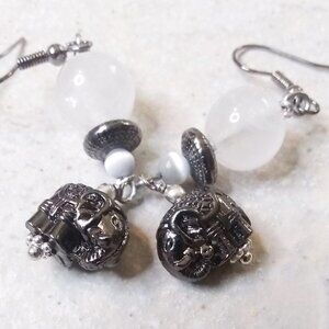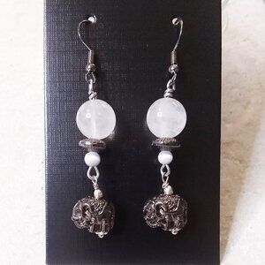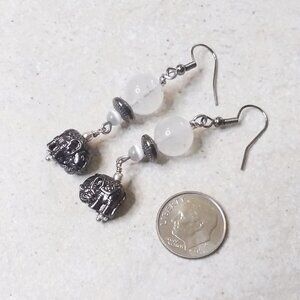 Handsome, longer gray & white Elephant dangle earrings made with genuine semi-precious gemstones!