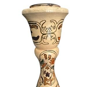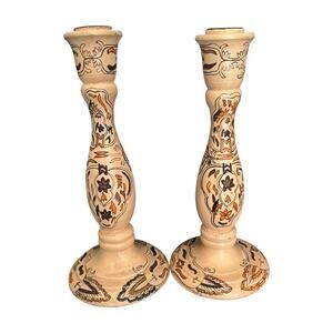 Very good pre owned condition set of 2 candleholders are hand painted in neutral colors with a peachy beige base and brown, tan, orange, and black intricate designs. Because these are hand made they are not identical and look like primitive art style. Measurements are as close as possible. One candlestick is about 9 1/4 inches tall and the other one is almost 9 1/2 inches tall. They are approximately 4 1/2 inches in diameter at the base 2 inches in diameter at the top and they each can hold a 3/4 of an inch in diameter candle. Well, these are lightweight they give heft in appearance.