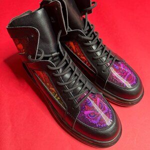 DETAILS: These black sneakers are crafted from PU leather, featuring a contoured, supportive shape and accented with beautiful printed inserts throughout. Available in US Men's size 10.5, they are in brand-new, no-tags condition and ready to elevate your outfits. Measurements: Foot length: 10.8 inches.