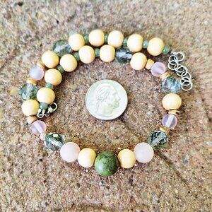 Crafted with pale varnished wood beading, 4 mm pale green glass beading, pale green faceted Czech glass beading, matte pink glass beading, coconut shell heishi beading, matte peach aventurine stone, with a beautiful polished southern green jade stone in the center.