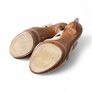 Sport these remarkably unique Jessica Simpson stilettos that come with a 2" high double platform and a heel height of about 6". These platform stilettos are certain to catch the eye and won't be around for long! They are pre-owned but remain in good condition, showing some wear on the soles and minor fading in the platform areas. Be sure to look closely at the photos!