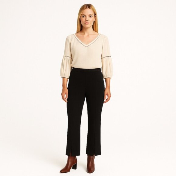 Joseph Ribkoff black stretch pants crochet trim front seam split leg size 6