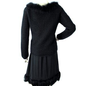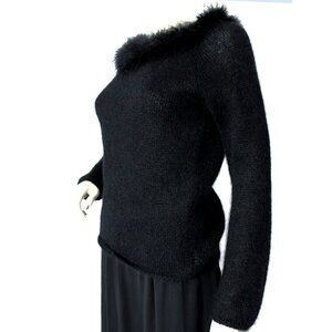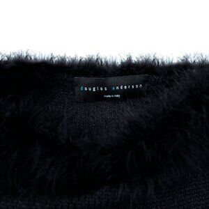 Italian designer, Douglas Anderson’s open neck pullover sweater is done in a lightweight, loosely woven knit comprised of 8% wool, 31% Polyamide and 61% kid goat hair with marabou trim at neck. Made in Italy.