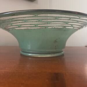 This unique green glass bowl is one of a kind. There wasn’t much that I could find regarding the history of this bowl. The green design is on the outside of the glass. It is not embedded in the glass. I also could not find any signature or marking that gave me an indication of who made the bowl