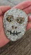 This unique handcrafted brooch features an intricate beaded face design in white and gold tones. Perfect for adding a touch of elegance to any outfit. McQueen style.