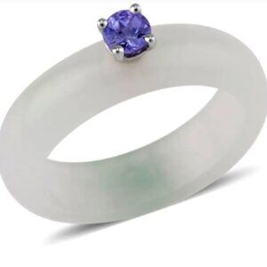 This exquisite band ring features a round-shaped AAA tanzanite, securely held in four prongs and set against a smooth jade band. The combination of pristine white jade and the vibrant tanzanite, all enhanced by rhodium over sterling silver