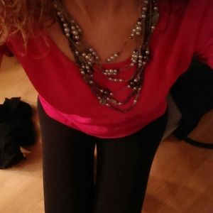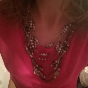 This necklace has a little bit of everything, pearls, beads, stone. Black and light gray colors. Is very versatile that you can wear it with a shirt and jeans during the weekend and with work attire during the week.