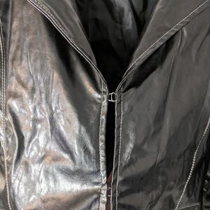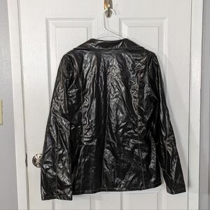 Women, Woman, Women's, Size M, Size Medium, Black, White Stitching, Contrast Stitching, Contrast, Details, Collar, Collared, Jacket, Outer Edge, Polyurethane, Vegan Leather, Leather, Lined, Long Sleeve, Rain Jacket, Pocket Front, Pockets, Nylon, Vintage Inspired, EUC, Faux Leather, Shiny, Sheen, Shine, Moto, Motorcycle, Hook and Eye Front, Hook Front, Cute, Unique, Rare, Patent Leather, Y2K, 90s, Retro, RN 57686