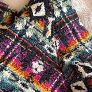 Like new, never worn by me, cute, colorful, patterned BoHo zip up, fleece jacket from a local boutique. Shorter at waist style, but not cropped.