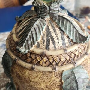 It is an octagon-shaped box with a lid, resembling a pineapple or tropical fruit.