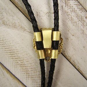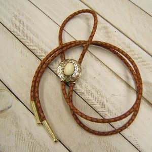 Unique Polished Brass Bolo Tie w Ivory Cabochon Leather Cord Western Neckties